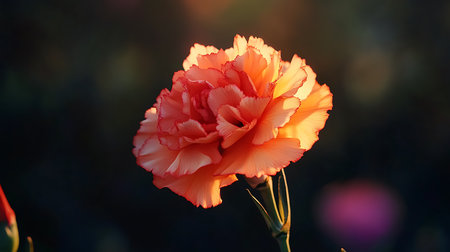 Features a captivating close up shot of an orange carnation flower with delicate texture, and artistic illumination on a dark setting enhancing its elegance.