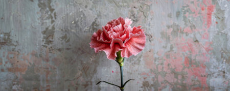 A carnation with a concrete backdrop and an empty wall. The ruffled, pink petals of the flower add texture and beauty to the minimalist flat lay composition.