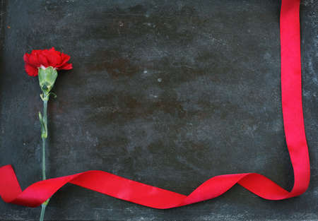 Black funeral ribbon and carnation flowers on dark background with space for text
