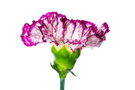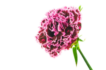 Beautiful bloming brindle burgundy pink colored carnation flower isolated on white background close up detail