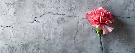 A carnation with a concrete backdrop and an empty wall. The ruffled, pink petals of the flower add texture and beauty to the minimalist flat lay composition.