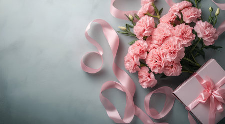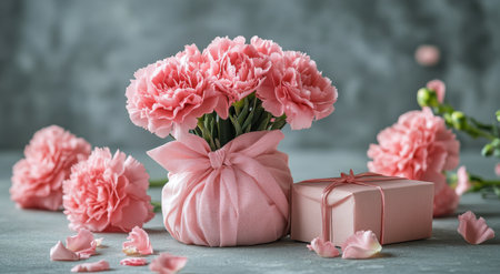 A beautiful bouquet of pink carnations sits next to a small gift box adorned with pink ribbons. This lovely arrangement creates a warm and inviting atmosphere, perfect for celebrating special moments or cherished relationships.