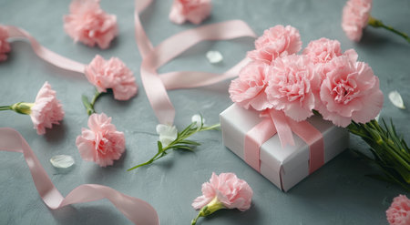 A delicate bouquet of pink carnations lies next to a beautifully wrapped gift box adorned with a ribbon. The soft petals and elegant packaging create a charming and festive atmosphere ideal for celebrating special occasions.