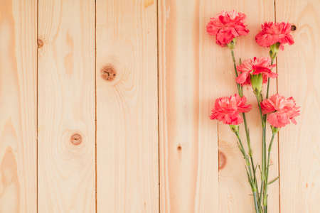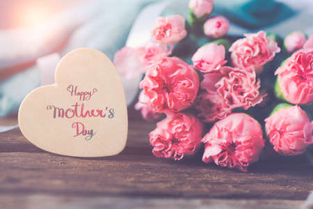 Still life with sweet carnation flowers on wooden table, Mothers day concept With a message for Happy Mother's Day on a wooden heart