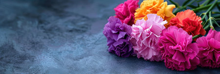 Colorful carnation flowers on a dark background with copy space.