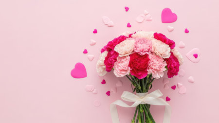 Pink and white carnation bouquet with scattered heart shapes on pastel background symbolizing romance love and celebration.