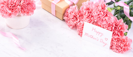 Pink carnation flowers with greeting card. Mother's Day is observed the second Sunday in May.