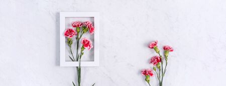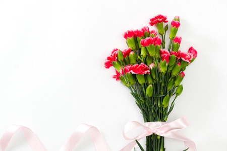 Design concept - Beautiful bunch of carnations on marble white background, top view, copy space, close up, mock up. Mothers day gift idea inspiration.