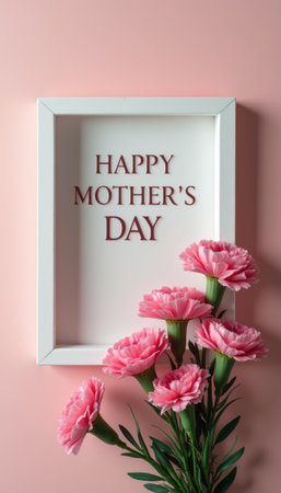 A beautiful arrangement featuring pink carnations beside a white frame displaying the heartfelt message Happy Mothers Day against a soft pink background. This image radiates warmth and love, perfect for celebrating the special bond between mothers and their children.