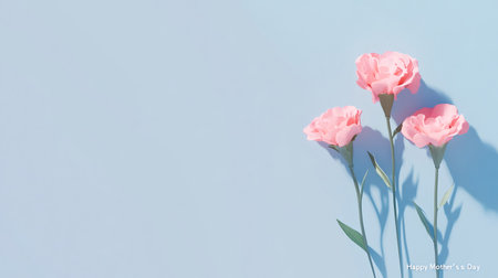 Pink carnation flowers stand tall against a light blue backdrop, casting subtle shadows, creating a serene and beautiful image ideal for mothers day celebrations and floral themed designs