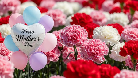 Mother's day greeting card with heart shaped balloons and carnation flowers