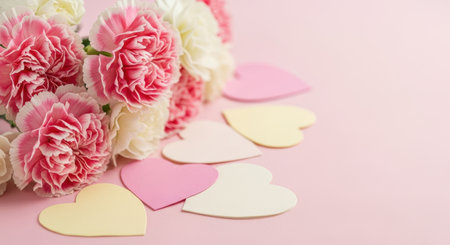 Pink and white carnation flowers with pastel paper hearts arranged on soft pink background for romantic celebration design.