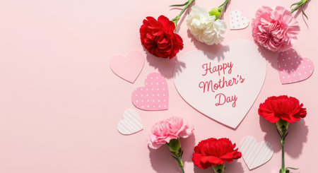 Happy mothers day greeting card with pink carnation flowers and paper hearts on pastel background for spring celebration concept.