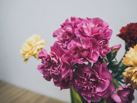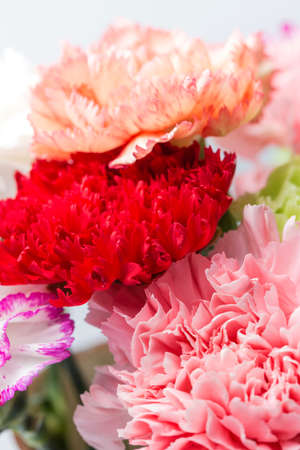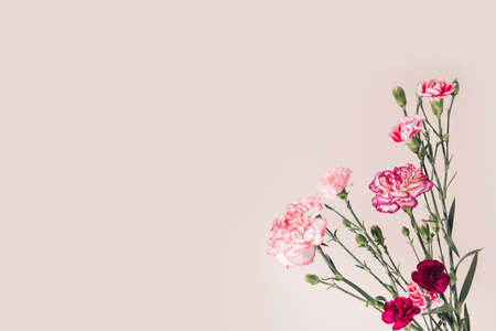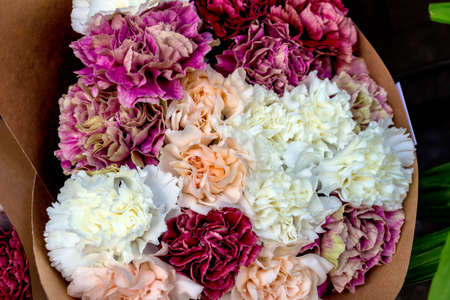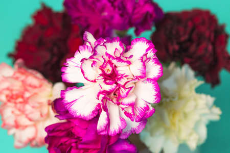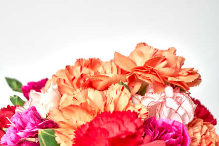 Beautiful bouquet of colorful carnations close up. Nature concept background. Copy space