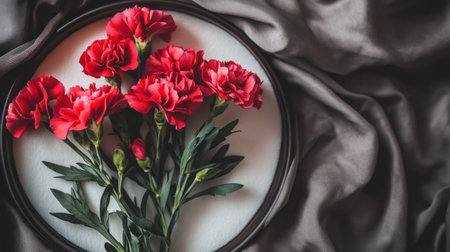 A top-down view of red carnations arranged in an oval pattern on the edge, with some blooming and others unblossomed, set against a white felt fabric on a circular tray. The background is a dark brown velvet, creating a romantic atmosphere. Soft lighting highlights their vibrant colors against the contrasting backdrop. --chaos 30 --ar 16:9 --v 6.1 Job ID: 8eeddbe2-38be-47c4-9c46-3ae400f21e83
