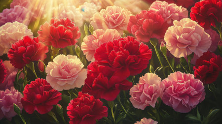 A breathtaking display of vivid carnations in a sunny garden, showcasing delicate petals in shades of pink and red, illuminated by soft light.