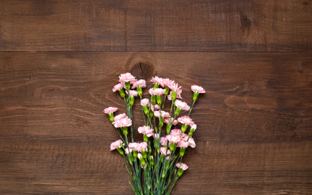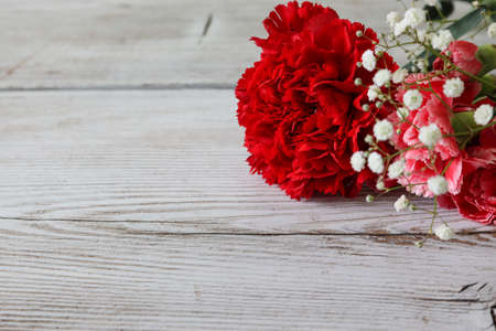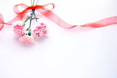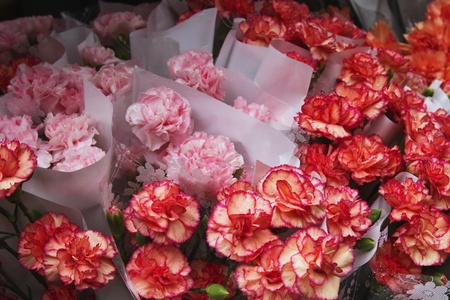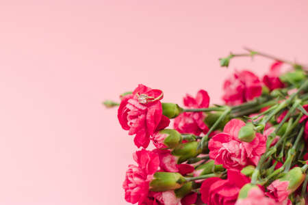 pink carnation flowers in a floral bouquet for gift of love and red background