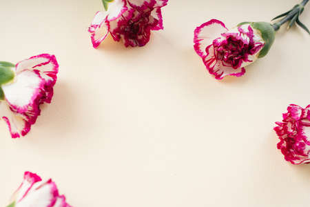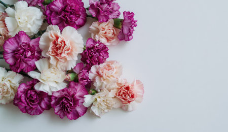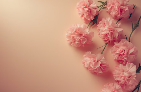 Carnation flowers against a clean, light peach background, offering ample copy space for text, in a top-down view, with soft tones that exude sophistication