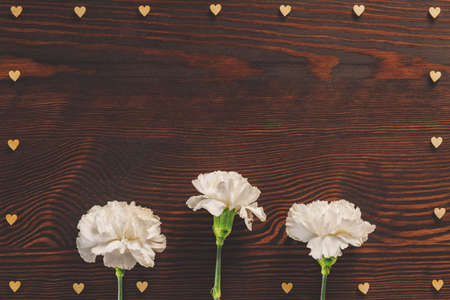 Pink and white carnation bouquet with scattered heart shapes on pastel background symbolizing romance love and celebration.