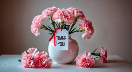 A still life of delicate pink carnations arranged in a white vase, adorned with a 'Thank You' tag and surrounded by loose blooms.