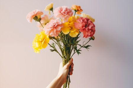 A close-up image of a hand holding a bouquet of pink carnations against a beige background. The image is soft and elegant, capturing the beauty of the flowers.