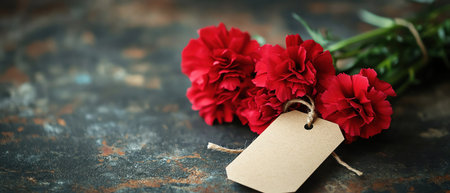Red carnation bundle, twinetied with blank tag, vintage tabletop