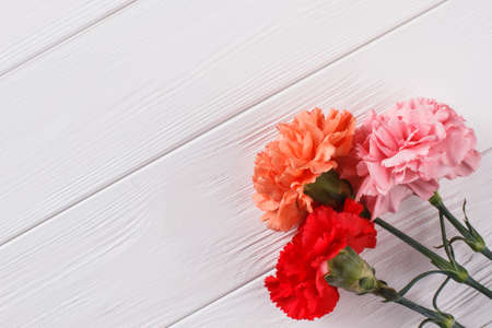 Carnation flowers and copyspace. Top view. Red, orange and pink flowers.
