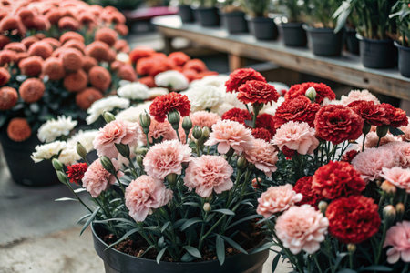 Beautiful collection of colorful carnations in soft focus showcasing vibrant shades of red and pink