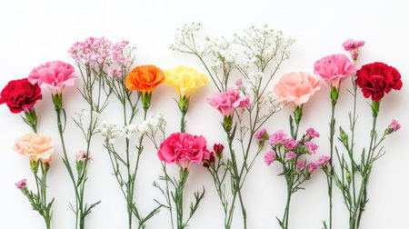 White, yellow, pink and red carnation flowers laid horizontally on white background.