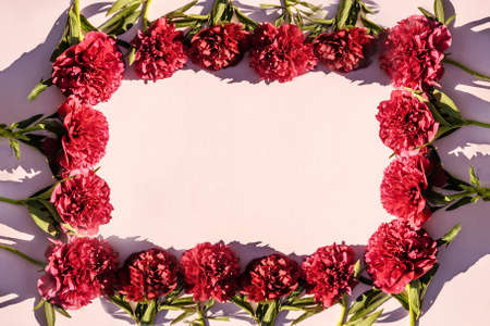 Frame made of beautiful pink peonies and blossoms on pink background. Greetings card for a love message, for a wedding with copy space.