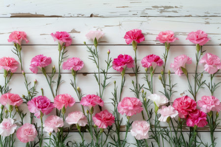 Elegant Pink Carnations on White Weathered Wood. A delicate array of pink carnations varying in shade from light to deep pink set against a white weathered wooden backdrop.