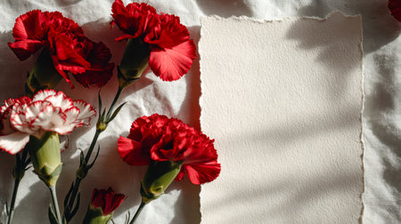 A sophisticated arrangement of crimson and snowy blossoms rests beside a textured, empty sheet, inspiring heartfelt messages and artistic expressions in any creative project.