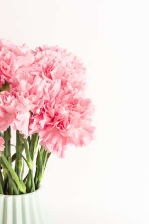 Delicate light pink carnation flowers in vase on a light gray background with copy space