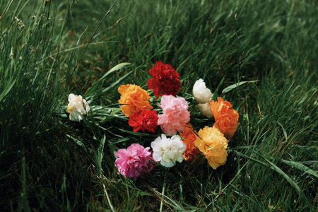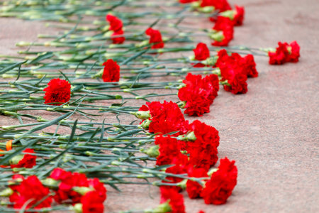 A row of red carnations are scattered on the ground. The flowers are arranged in a way that they are not in a vase, but rather on the ground. Concept of beauty and naturalness