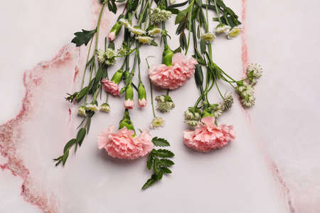 Pastel pink carnation flowers on green background. flat lay, top view, copy space