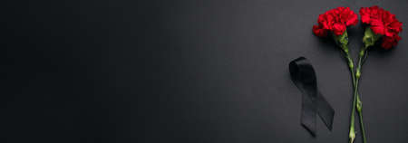 Black funeral ribbon and carnation flowers on dark background with space for text