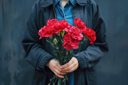 Person in a blue shirt and black coat holding a bouquet of red carnations.