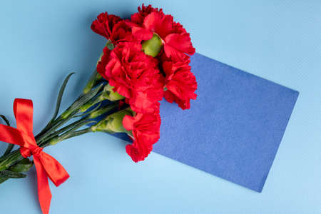red carnation and blue envelope with space for text on a blue background, top view, festive background, postcard for defender of the fatherland day, womens day, March 8, mothers day