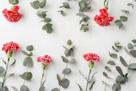 Floral pattern of red carnations, green leaves, branches on a white background.