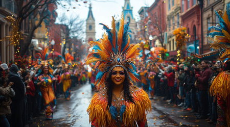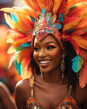 A radiant carnival queen with a feathered headdress and joyous expression amidst a festive backdrop