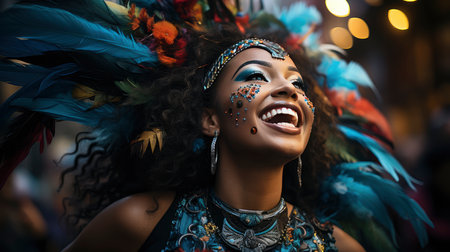 Joyous female dancer celebrates with a bright feather headdress and costume at a night carnival parade