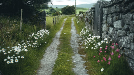 A picturesque country lane bordered by blooming wildflowers and rustic stone walls, inviting a peaceful stroll through nature's beauty and tranquility.