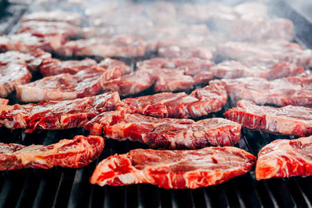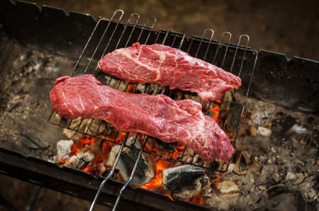 Cooking meat steaks on the fire on the grill at night, top view. Defocus