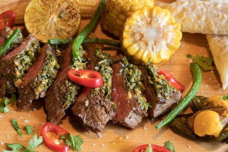 Close-up of grilled steak meat on a wooden board with vegetable tortilla and dip. The food is isolated on a black background.