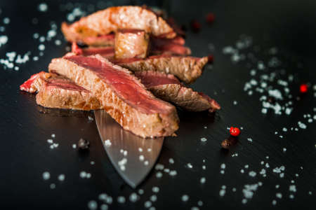 Medium rare steak slices on a knife on black plate, with salt flakes and peppercorns