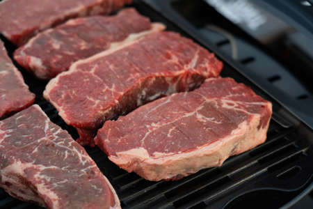 Step by step. Raw New York strip steak ready for outdoor grilling.