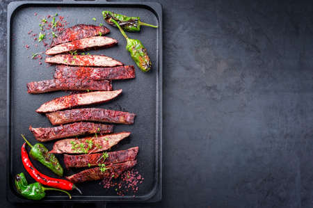 american food. The concept cooking meat. pieces of beef steaks from grill. concept cooking meat with smoke, spices and rosemary.