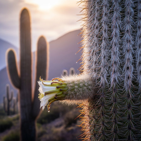 close-up of a blooming saguaro cactus at sunset, created with generative ai