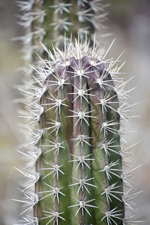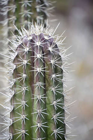 Macro the row of sharp thorns from Columnar cactus in a garden, daylight image, selected focus, empty space for copy and design, Selected focus.