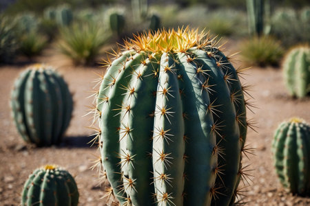 A close-up of a barrel cactus with sharp spines, bathed in warm sunlight in the middle of a vast desert